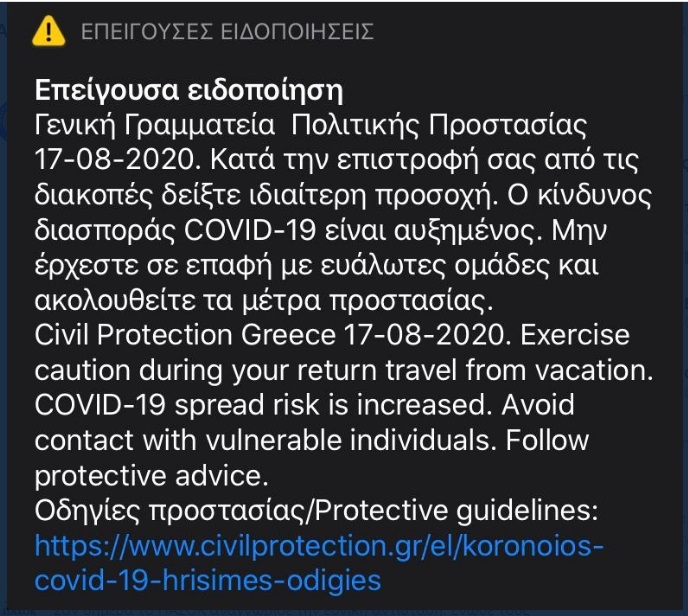 Αποφασίστηκε δε η αποστολή πανελλαδικού μηνύματος από το 112 για την ανάγκη τήρησης των μέτρων προστασίας για όσους επιστρέφουν.