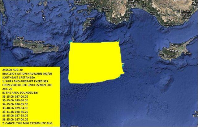 Σύμφωνα με πληροφορίες του Militaire, «κατόπιν της παράτασης της προηγούμενης παράνομης αγγελίας NAVTEX στην οποία προχώρησε η Τουρκία το απόγευμα της 23ης Αυγούστου για την συνέχιση των ερευνών του “Oruc Reis” έως τις 27 Αυγούστου 2020 και 23.59 ώρα Ελλάδος, η Ελλάδα θα δεσμεύσει με αγγελία NAVTEX περιοχή αεροναυτικών ασκήσεων εντός ελληνικής υφαλοκρηπίδας στην ευρύτερη περιοχή ΝΑ Κρήτης, Καρπάθου, Ρόδου και Νοτίως Καστελορίζου.