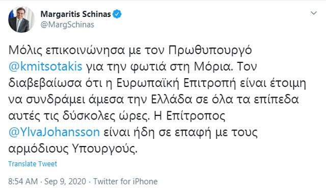«Μόλις επικοινώνησα με τον Πρωθυπουργό @kmitsotakis για την φωτιά στη Μόρια. Τον διαβεβαίωσα ότι η Ευρωπαϊκή Επιτροπή είναι έτοιμη να συνδράμει άμεσα την Ελλάδα σε όλα τα επίπεδα αυτές τις δύσκολες ώρες. Η Επίτροπος @YlvaJohansson είναι ήδη σε επαφή με τους αρμόδιους Υπουργούς».