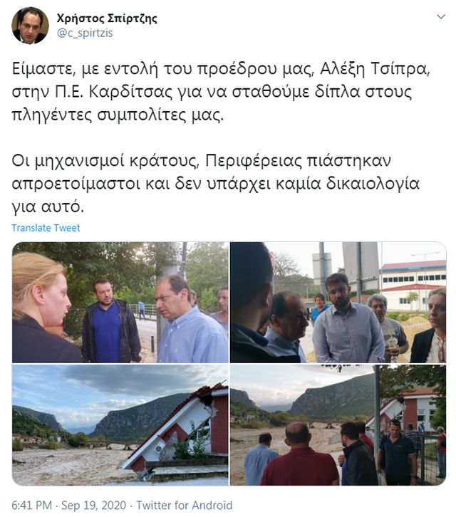 Πρόσθεσε ότι «ο κυκλώνας Ιανός αναμενόταν εδώ και αρκετές ημέρες, δεν ήταν κάτι ξαφνικό ή έκτακτο» και ότι «η κυβέρνηση, η τοπική αυτοδιοίκηση και ειδικά η περιφέρεια Θεσσαλίας, η πολιτική προστασία όφειλαν να ήταν απόλυτα προετοιμασμένες».