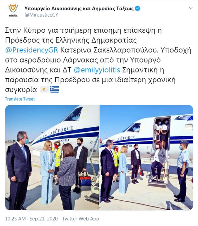 Επίσημη επίσκεψη στην Κύπρο πραγματοποιεί, από σήμερα Δευτέρα 21/09 έως και την Τετάρτη 23/09, η Πρόεδρος της Ελληνικής Δημοκρατίας Κατερίνα Σακελλαροπούλου.