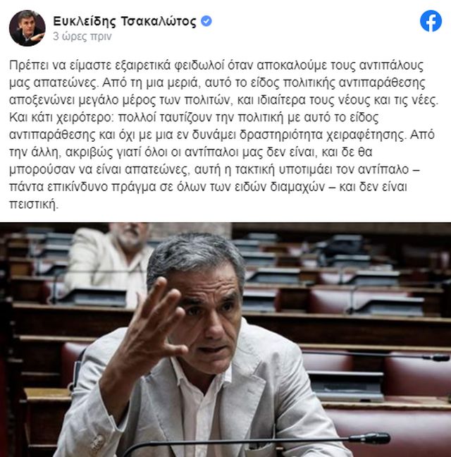 »Από την άλλη, ακριβώς γιατί όλοι οι αντίπαλοι μας δεν είναι, και δε θα μπορούσαν να είναι απατεώνες, αυτή η τακτική υποτιμάει τον αντίπαλο – πάντα επικίνδυνο πράγμα σε όλων των ειδών διαμαχών – και δεν είναι πειστική», έγραψε.