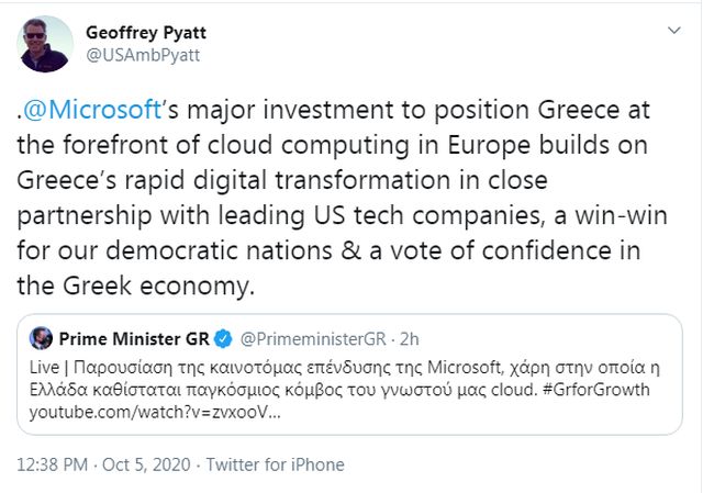 Με μία ανάρτηση μεστή νοημάτων χαιρέτησε ο Τζέφρι Πάιατ την ανακοίνωση της επένδυσης ύψους 1 δισ. της αμερικανικής Microsoft στην Ελλάδα.