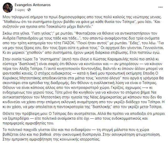 «Μου τηλεφωνεί σήμερα το πρωί δημοσιογράφος απο τους πολύ καλούς της νεώτερης γενιας. “Μαθαίνω ότι τα συστήματα έχουν βαλθει να φάνε με κάθε θυσία τον Τσίπρα”, μου λέει. “Και συζητούν για ηγεσια απο Τσακαλώτο μέχρι Βαλντέν.”