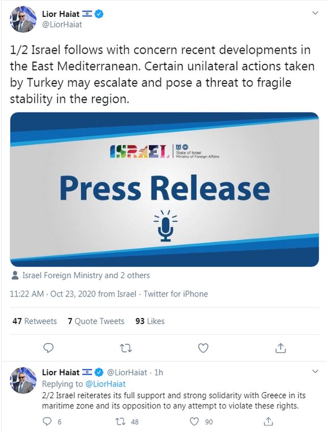 Ο εκπρόσωπος του υπουργείου Εξωτερικών του Ισραήλ κ. Lior Haiat, με ανάρτησή του στο Twitter, εξέφρασε σαφή υποστήριξη και αλληλεγγύη στην Ελλάδα απέναντι στην τουρκική επιθετικότητα: