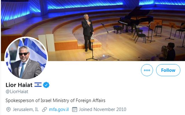 Αξίζει να σημειωθεί ότι ο εκπρόσωπος του υπουργείου Εξωτερικών του Ισραήλ έχει φωτογραφία στον λογαριασμό του στο Twitter με φόντο ισραηλινές και ελληνικές σημαίες (κεντρική εικόνα και κάτω).