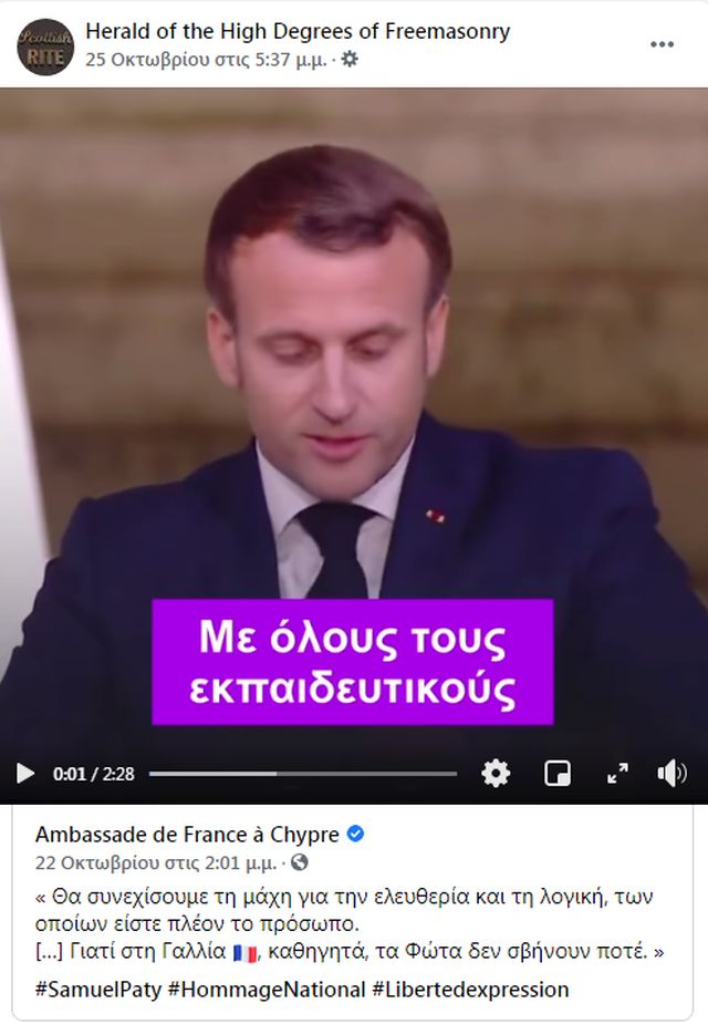 Η νόμιμη και κανονική διοίκηση του Σκωτικού Τύπου, που εδρεύει στην οδό Σουρμελή 2, δίπλα στο Μέγαρο της Μεγάλης Στοάς της Ελλάδος (Αχαρνών), που εκπροσωπεί την αφρόκρεμα του ελληνικού Ελευθεροτεκτονισμού και συνδέεται με το μητρικό Ύπατο Συμβούλιο της Νότιας Δικαιοδοσίας των ΗΠΑ, αναδημοσίευσε, ασχολίαστη, ανάρτηση της Γαλλικής Πρεσβείας στην Κύπρο με απόσπασμα της ομιλίας του Γάλλου προέδρου και τη λεζάντα: