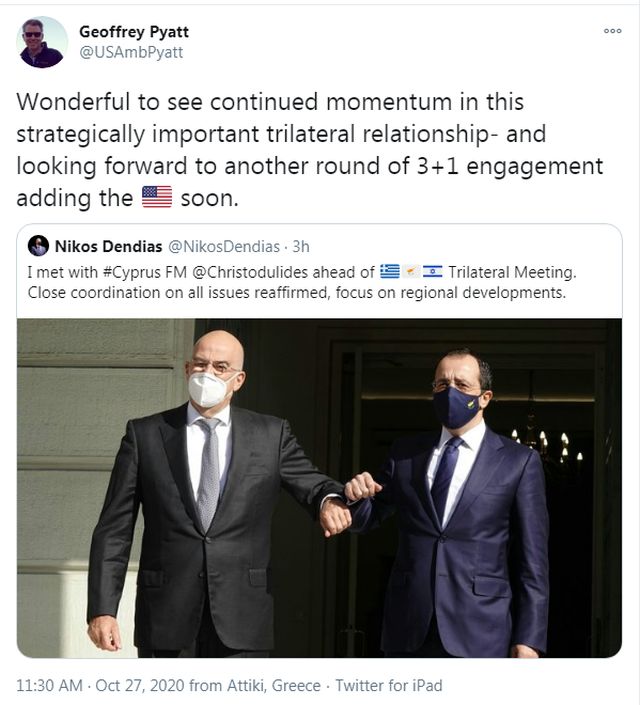 Με ενθουσιασμό χαιρέτησε ο Τζέφρι Πάιατ, με ανάρτησή του στο Twitter, την τριμερή σχέση Ελλάδας, Κύπρου, Ισραήλ, με αφορμή τη συνάντηση των ΥΠΕΞ των τριών συμμάχων χωρών στην Αθήνα.