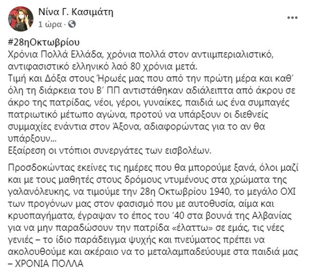 Σε μήνυμά της για την 28η Οκτωβρίου, η βουλευτής του ΣΥΡΙΖΑ – Προοδευτική Συμμαχία, Νίνα Κασιμάτη, έγραψε: