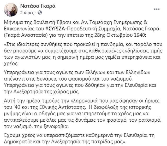 Σε μήνυμά της για την 28η Οκτωβρίου η βουλευτής του ΣΥΡΙΖΑ – Προοδευτική Συμμαχία, Νατάσα Γκαρά, αναφέρει:
