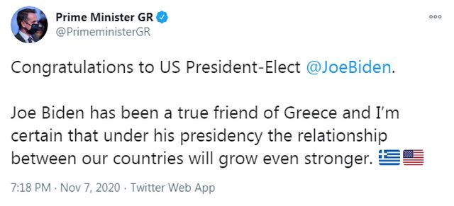 Συγχαρητήρια ανάρτηση για την εκλογή του Τζο Μπάιντεν έκανε ο πρωθυπουργός Κυριάκος Μητσοτάκης.