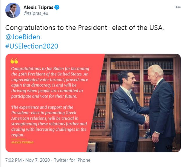 Τα συγχαρητήριά του στον Δημοκρατικό υποψήφιο Τζο Μπάιντεν ο οποίος όπως φαίνεται κερδίζει τις αμερικανικές εκλογές εξέφρασε ο πρόεδρος του ΣΥΡΙΖΑ – Προοδευτική Συμμαχία Αλέξης Τσίπρας.