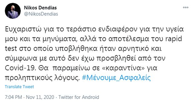 Ο υπουργός Εξωτερικών, Νίκος Δένδιας, με ανάρτησή του στο Twitter το απόγευμα της Τετάρτης γνωστοποίησε ότι βρέθηκε αρνητικός στο τεστ για κορωνοϊό, ωστόσο, θα παραμείνει σε καραντίνα για προληπτικούς λόγους.