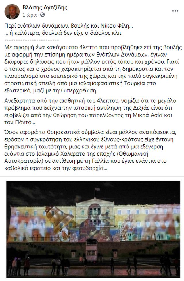 Φωνή λογικής και ψυχραιμίας απέναντι στις εξαλλοσύνες ο ιστορικός, συγγραφέας και υποψήφιος ευρωβουλευτής με τον ΣΥΡΙΖΑ-ΠΣ, Βλάσης Αγτζίδης, που οι γνωρίζοντες τον αναγνωρίζουν ως μία από τις προσωπικότητες της πατριωτικής αριστεράς. Σχολιάζοντας, στο προφίλ του στο Facebook, τις αντιδράσεις για το βίντεο των ενόπλων δυνάμεων που προβλήθηκε στην πρόσοψη της Βουλής, έγραψε: