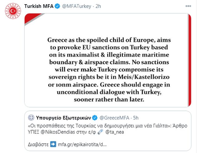«Η Ελλάδα, ως το κακομαθημένο τέκνο της Ευρώπης, αποσκοπεί στην πρόκληση κυρώσεων της Ευρωπαϊκής Ένωσης κατά της Τουρκίας με βάσης τους [ελληνικούς] μαξιμαλιστικούς και παράνομους ισχυρισμούς περί των θαλασσίων συνόρων και του εναεριού χώρου», ανέφερε η ανακοίνωση του τουρκικού υπουργείου.