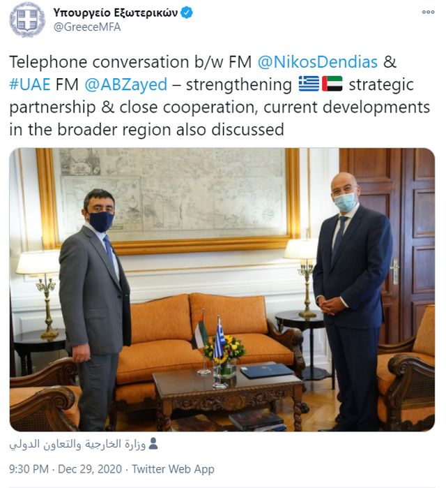 Τηλεφωνική επικοινωνία με τον ομόλογό του των Ηνωμένων Αραβικών Εμιράτων, Αμπντουλάχ Μπιν Ζαγιέντ Αλ Ναχιάν, είχε την Τρίτη ο υπουργός Εξωτερικών Νίκος Δένδιας.