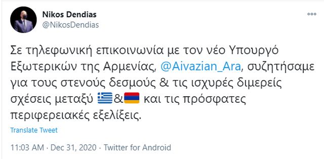 «Σε τηλεφωνική επικοινωνία με τον νέο Υπουργό Εξωτερικών της Αρμενίας, Ara Aivazian, συζητήσαμε για τους στενούς δεσμούς και τις ισχυρές διμερείς σχέσεις μεταξύ Ελλάδος και Αρμενίας και τις πρόσφατες περιφερειακές εξελίξεις».