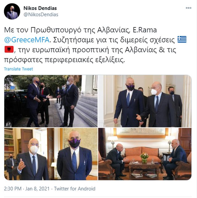»Συζητήσαμε για τις διμερείς σχέσεις Ελλάδας – Αλβανίας, την ευρωπαϊκή προοπτική της Αλβανίας και τις πρόσφατες περιφερειακές εξελίξεις», έγραψε σε ανάρτησή του στο Twitter ο Έλληνας υπουργός Εξωτερικών.