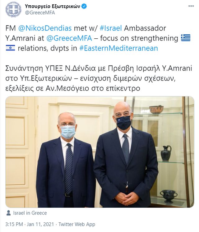 «Συνάντηση ΥΠΕΞ Ν. Δένδια με Πρέσβη Ισραήλ Y. Amrani στο Υπ. Εξωτερικών – ενίσχυση διμερών σχέσεων, εξελίξεις σε Αν. Μεσόγειο στο επίκεντρο», έγραψε στο Twitter το υπουργείο Εξωτερικών.