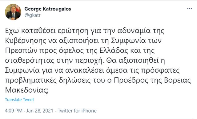 «Έχω καταθέσει ερώτηση για την αδυναμία της Κυβέρνησης να αξιοποιήσει τη Συμφωνία των Πρεσπών προς όφελος της Ελλάδας και της σταθερότητας στην περιοχή.