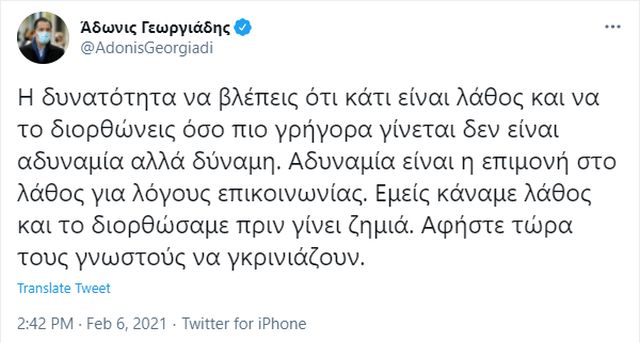 Ο κ. Γεωργιάδης, λίγο νωρίτερα είχε γράψει: «Συγγνώμη για την αναστάτωση αλλά αυτό το μέτρο που αποφασίστηκε χθες υπό τις προτάσεις της επιτροπής δεν μπορούσε πρακτικά να υλοποιηθεί.