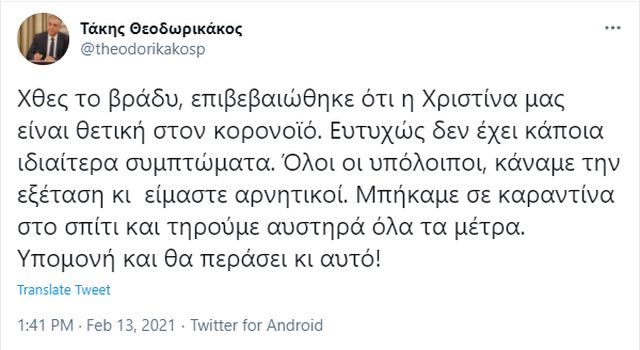 O κ. Θεοδωρικάκος, που έκανε γνωστή μέσω twitter την είδηση, ανέφερε ότι βγήκε αρνητικός στο τεστ και ότι τίθεται προληπτικά σε κατ’ οίκον απομόνωση, όπως επιβάλλεται σε τέτοιες περιπτώσεις.