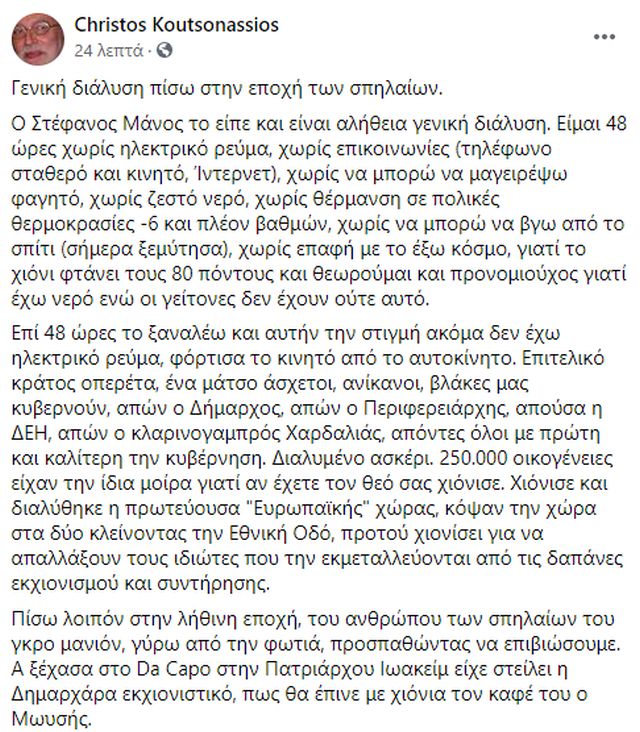 «Γενική διάλυση πίσω στην εποχή των σπηλαίων» τιτλοφορεί ανάρτησή του στο Facebook ο δικηγόρος και στέλεχος του ΠΡΑΤΤΩ Χρήστος Κουτσονάσιος, όπου περιγράφει τη βασανιστική κατάσταση που βιώνει, όπως και εκαντοντάδες χιλιάδες Έλληνες που έμειναν δίχως ηλεκτρικό ρεύμα.