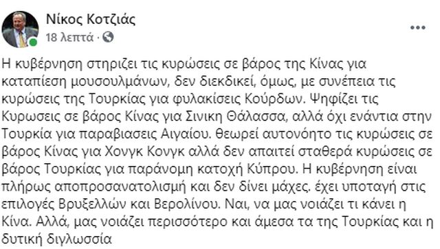 Ο Νίκος Κοτζιάς επισημαίνει, με ανάρτησή του στο Facebook την Κυριακή, ότι ενώ η Τουρκία κάνει ακριβώς ό,τι και η Κίνα, στη δεύτερη επιβάλλονται κυρώσεις και στην πρώτη όχι.