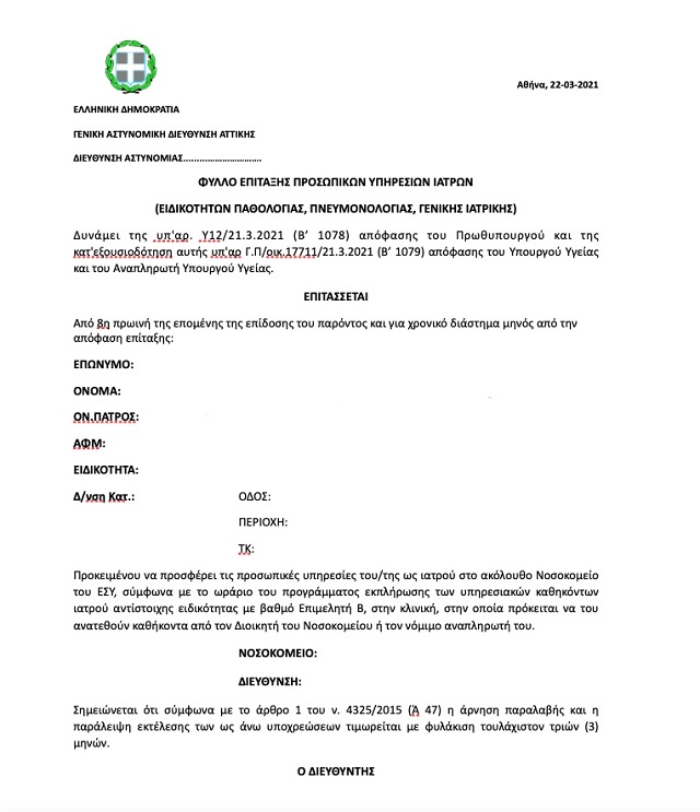 Τα φύλλα επίταξης παραδόθηκαν στη Γενική Αστυνομική Διεύθυνση Αττικής σήμερα Δευτέρα 22/3 και από εκεί διανεμήθηκαν στις κατά τόπους αστυνομικές διευθύνσεις και τμήματα για να επιδοθούν σε 206 ιδιώτες ιατρούς (παθολόγους, πνευμονολόγους και γενικούς γιατρούς) στην Αττική και ειδικότερα 78 στον τομέα Αθηνών, 36 στον Πειραιά, 30 στη νοτιανατολική Αττική, 36 στη βορειανατολική Αττική και 26 στη Δυτική Αττική.