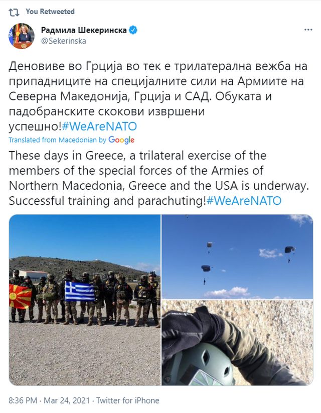 Αξίζει να σημειωθεί ότι το προσωπικό από τη Δημοκρατία της Βόρειας Μακεδονίας που συμμετείχε στην συνεκπαίδευση είναι απόφοιτοι του Σχολείου Βασικής Εκπαίδευσης Αλεξιπτωτιστού (ΣΒΕΑ) που εκτελέστηκε στη Σχολή Αλεξιπτωτιστών (ΣΧΑΛ) το 2020.