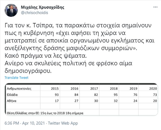«Για τον κ. Τσιπρα τα παρακάτω στοιχεία σημαίνουν πως η κυβέρνηση “έχει αφήσει τη χώρα να μετατραπεί σε αποικία οργανωμένου εγκλήματος και ανεξέλεγκτης δράσης μαφιόζικών συμμοριών”.