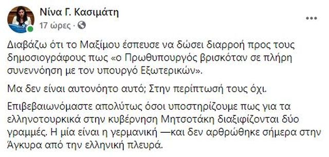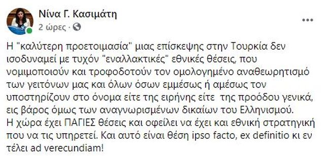 Με δύο αναρτήσεις στο Facebook σχολίασε η σοσιαλίστρια βουλευτής του ΣΥΡΙΖΑ-ΠΣ, Νίνα Κασιμάτη, τη «μονομαχία» Δένδια-Τσαβούσογλου στην Άγκυρα. Η σοσιαλπατριώτισσα βουλευτής της Β΄ Πειραιά έγραψε στην πρώτη ανάρτησή της το απόγευμα της Πέμπτης: