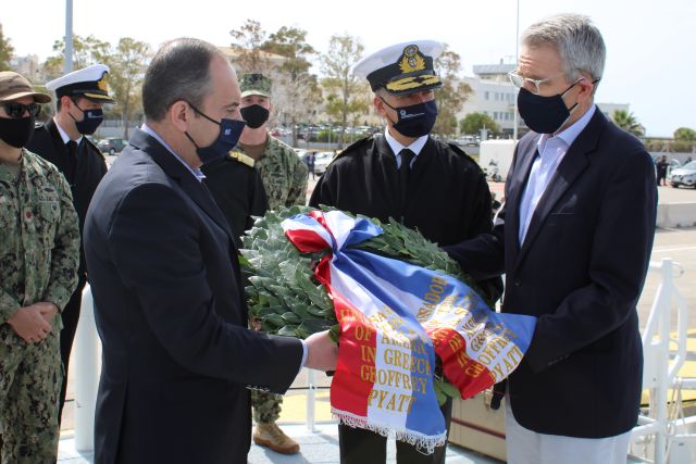 Κατά τη διάρκεια περιήγησης στα δύο σκάφη, ο κ. Πλακιωτάκης και ο κ. Πάιατ πραγματοποίησαν ρίψη στεφάνου προς τιμήν της συμπλήρωσης των 200 ετών από την Ελληνική Επανάσταση, ενώ ο Αμερικανός πρέσβης τόνισε τη σημασία της στρατηγικής συνεργασίας ΗΠΑ – Ελλάδας.