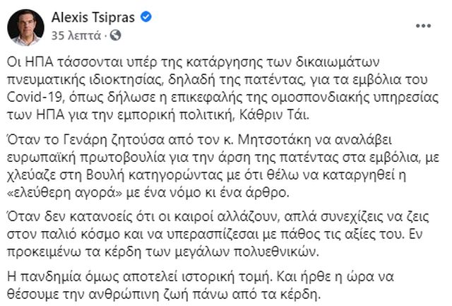 Ο αρχηγός της αξιωματικής αντιπολίτευσης, Αλέξης Τσίπρας, με ανάρτησή του στο Facebook χαιρέτησε τη θέση της αμερικανικής κυβέρνησης υπέρ της κατάργησης της πατέντας των εμβολίων. Εξάλλου είναι και δική του πρόταση, εδώ κι ένα εξάμηνο, η οποία απαντήθηκε με χλεύη από τον Κυριάκο Μητσοτάκη.