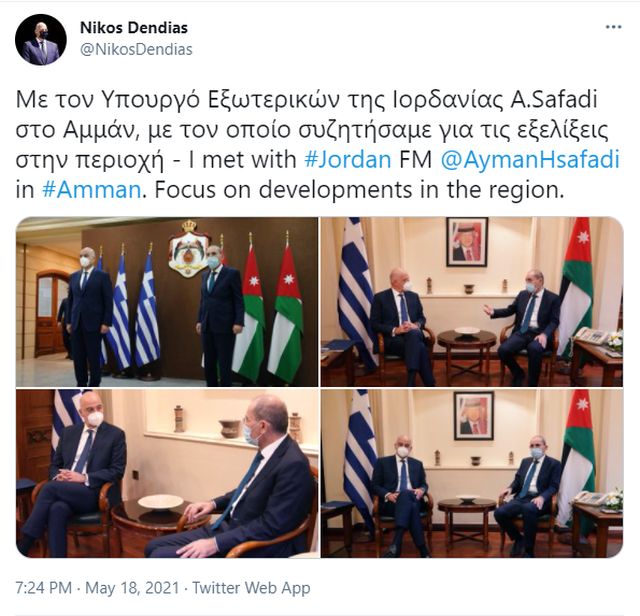 Ο Έλληνας υπουργός Εξωτερικών έγραψε στο Twitter: «Με τον Υπουργό Εξωτερικών της Ιορδανίας A.Safadi στο Αμμάν, με τον οποίο συζητήσαμε για τις εξελίξεις στην περιοχή».