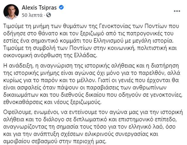 Ο πρόεδρος του ΣΥΡΙΖΑ-ΠΣ Αλέξης Τσίπρας, σε ανάρτησή του στο Facebook για την ημέρα μνήμης της Γενοκτονίας των Ποντίων (19 Μαΐου), έγραψε: