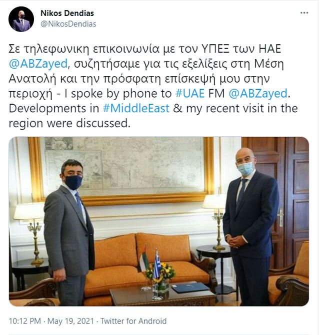 «Σε τηλεφωνική επικοινωνία με τον ΥΠΕΞ των ΗΑΕ @ABZayed, συζητήσαμε για τις εξελίξεις στη Μέση Ανατολή και την πρόσφατη επίσκεψή μου στην περιοχή», αναφέρει σε ανάρτησή του στο Twitter ο Έλληνας υπουργός Εξωτερικών.