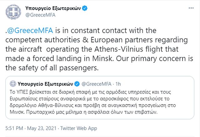 «Το υπουργείο Εξωτερικών βρίσκεται σε διαρκή επαφή με τις αρμόδιες υπηρεσίες και τους Ευρωπαίους εταίρους αναφορικά με το αεροσκάφος που εκτελούσε το δρομολόγιο Αθήνα-Βίλνιους και προέβη σε αναγκαστική προσγείωση στο Μινσκ», αναφέρει σε ανάρτηση στο twitter το υπουργείο Εξωτερικών.