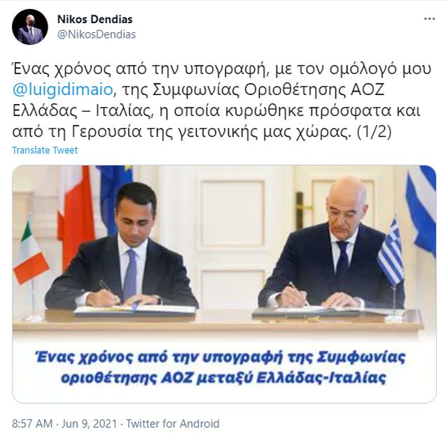 «Ένας χρόνος από την υπογραφή, με τον ομόλογό μου Λουίτζι Ντι Μάιο, της Συμφωνίας Οριοθέτησης ΑΟΖ Ελλάδας-Ιταλίας, η οποία κυρώθηκε πρόσφατα και από τη Γερουσία της γειτονικής μας χώρας», ανέφερε.