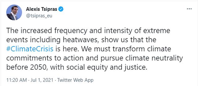 Με την κλιματική κρίση συσχετίζει τους καύσωνες ο πρόεδρος ΣΥΡΙΖΑ-ΠΣ, Αλέξης Τσίπρας σε ανάρτησή του στο Twitter στα αγγλικά, τονίζοντας τη σημασία της επίτευξης κλιματικής ουδετερότητας το 2050.