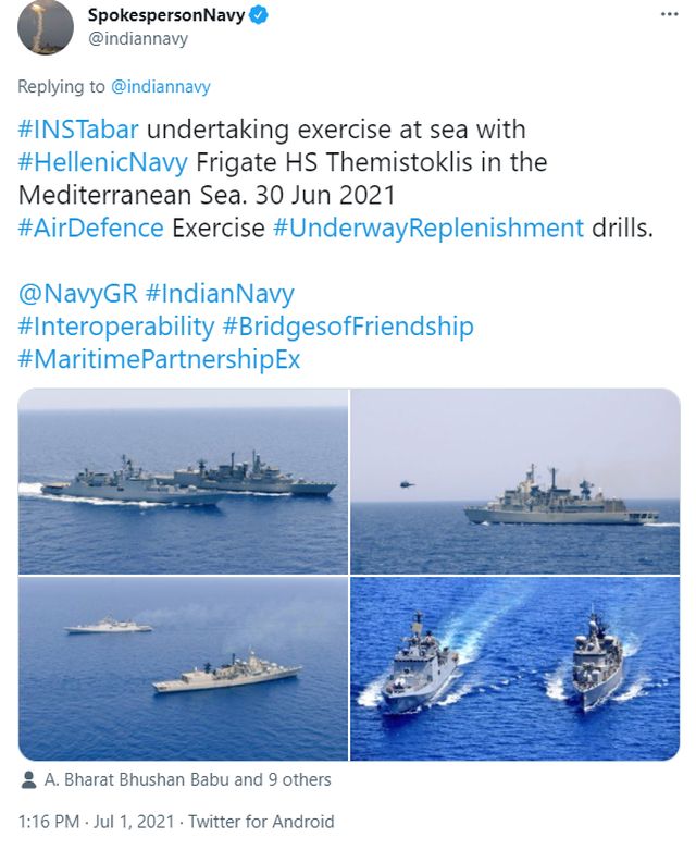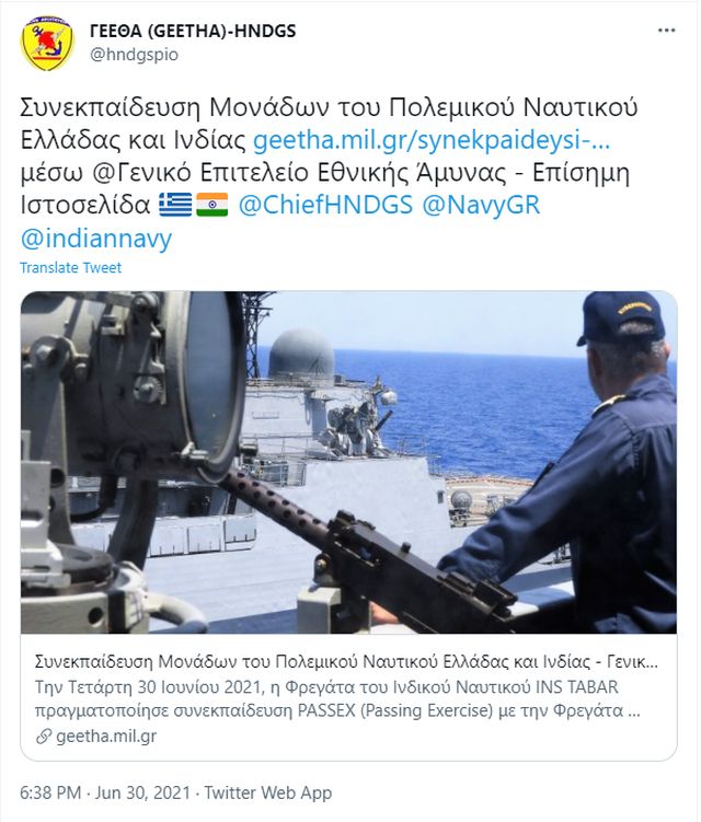 Δημοσίευμα για την «Αραβική Άμυνα» αναφέρεται στις κοινές ναυτικές ασκήσεις Ελλάδας και Ινδίας που πραγματοποιήθηκαν στο Νότιο Κρητικό Πέλαγος, νοτιοδυτικά της Κρήτης, από το πολεμικό σκάφος της Ινδίας «INS Tabar» με τη φρεγάτα «Θεμιστοκλής».