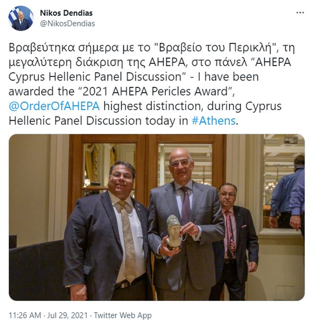 Ο υπουργός Εξωτερικών, Νίκος Δένδιας, βραβεύτηκε την Πέμπτη από το τάγμα της AHEPA με το «Βραβείο του Περικλή», που αποτελεί τη μεγαλύτερη διάκριση της ιστορικής αυτής ομογενειακής οργάνωσης.