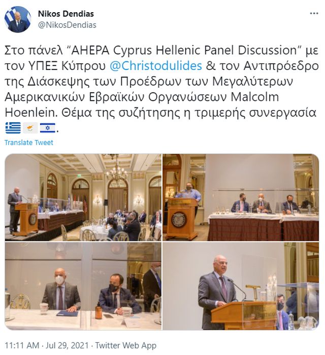 Νωρίτερα ο Νίκος Δένδιας είχε συμμετάσχει στο πάνελ «AHEPA Cyprus Hellenic Panel Discussion», μαζί με τον Κύπριο ομόλογό του, Νίκο Χριστοδουλίδη και τον Αντιπρόεδρο της Διάσκεψης των Προέδρων των Μεγαλύτερων Αμερικανικών Εβραϊκών Οργανώσεων, Malcolm Hoenlein.