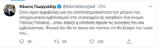 «Όσοι είχαν αμφιβολίες για την αποτελεσματικότητα του μέτρου του υποχρεωτικού εμβολιασμού στα νοσοκομεία ας σκεφθούν ένα όνομα: Παύλος Πολάκης…», ανέφερε στο tweet του ο κ. Γεωργιάδης και συμπλήρωνε: