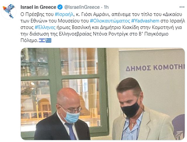 Σε εκδήλωση στην Κομοτηνή την Πέμπτη το απόγευμα ο Πρέσβης του Ισραήλ, κ. Γιόσι Αμράνι, απένειμε τα μετάλλια και τον τίτλο του «Δικαίου των Εθνών» του Μουσείου του Ολοκαυτώματος Γιάντ Βασέμ στο Ισραήλ στους Έλληνες ήρωες Βασιλική και Δημήτριο Κιακίδη, για την διάσωση της Ελληνοεβραίας Ντόνα Ροντρίγκ στο Β’ Παγκόσμιο Πόλεμο.
