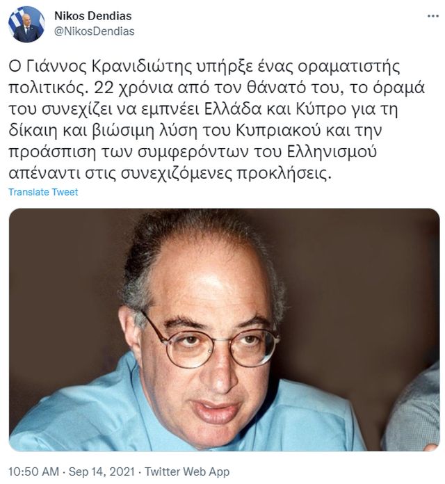 »Σήμερα, 22 χρόνια από τον θάνατό του, το όραμα του Γιάννου Κρανιδιώτη συνεχίζει να εμπνέει την Ελλάδα και την Κύπρο στις προσπάθειές τους για μια δίκαιη και βιώσιμη λύση του Κυπριακού, καθώς και για την προάσπιση των συμφερόντων του Ελληνισμού απέναντι στις συνεχιζόμενες προκλήσεις».