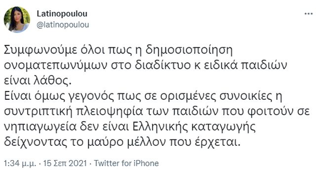 Η Αφροδίτη Λατινοπούλου με ανάρτησή της στο Twitter υπογραμμίζει ότι είναι λάθος η δημοσιοποίηση ονοματεπωνύμων στο διαδίκτυο και ειδικά παιδιών, ωστόσο, στη συνέχεια προχωρά σε ένα ρατσιστικό παραλήρημα γράφοντας: