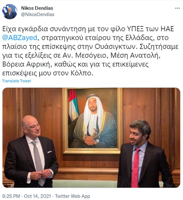 «Είχα εγκάρδια συνάντηση με τον φίλο ΥΠΕΞ των ΗΑΕ Αμπντουλάχ Μπιν Ζαγιέντ Αλ Ναχιάν, στρατηγικού εταίρου της Ελλάδας, στο πλαίσιο της επίσκεψης στην Ουάσιγκτων.