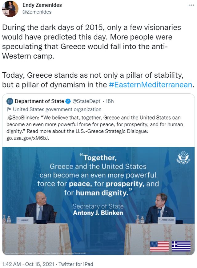 »Ηνωμένες Πολιτείες Ελλάδα Ισχυρότερες Μαζί», κατέληξε.