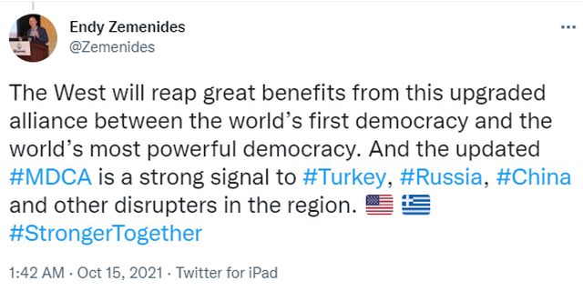 »Και η αναθεωρημένη MDCA είναι ένα ισχυρό μήνυμα προς την Τουρκία, τη Ρωσία, την Κίνα και άλλους που διαταράζουν την περιοχή.